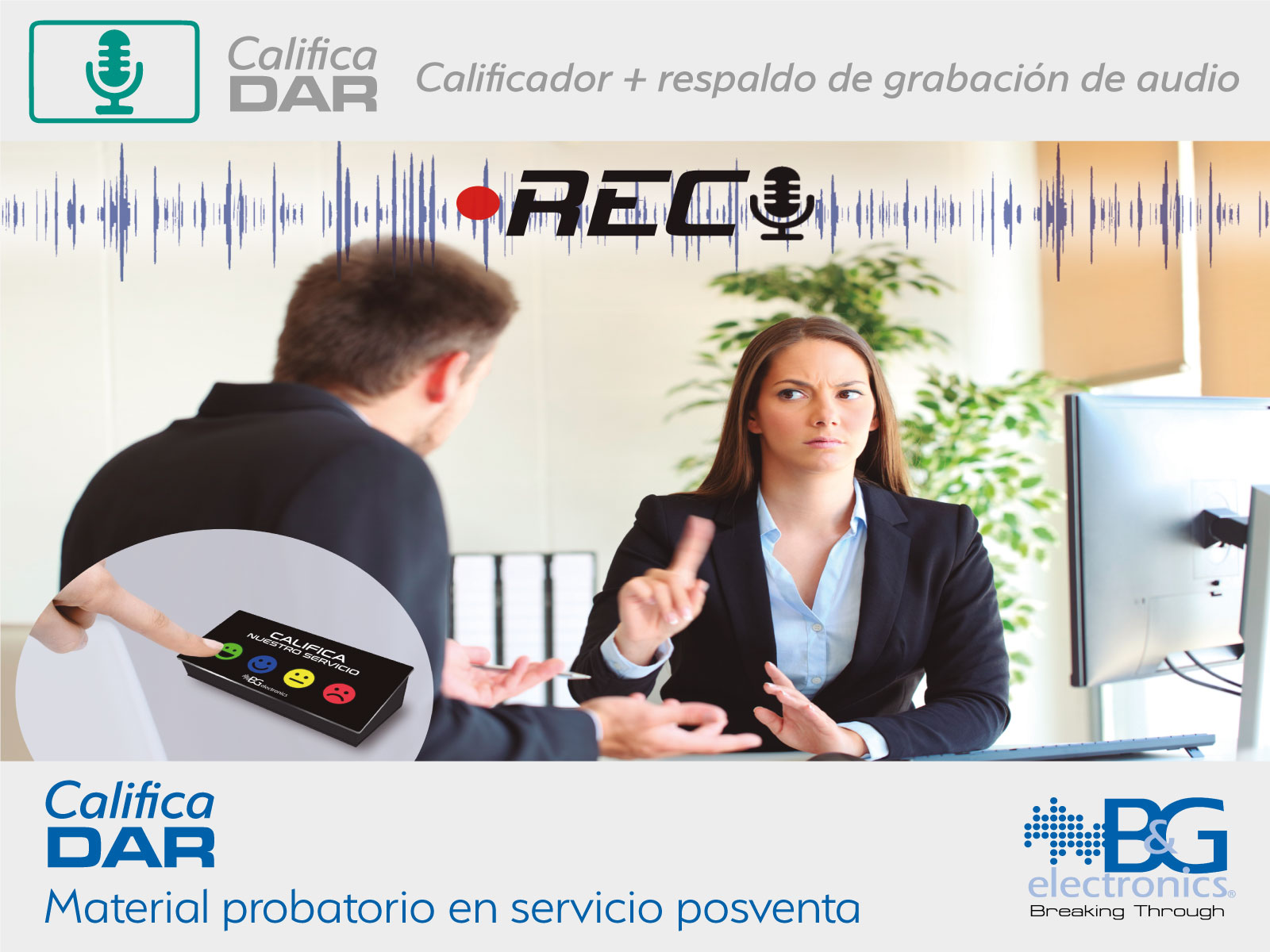 Registra la calificación del servicio prestado por el colaborador en conexión con el grabador de audio DAR para proporcionar una información completa. Incluye un software para procesar la información registrada.