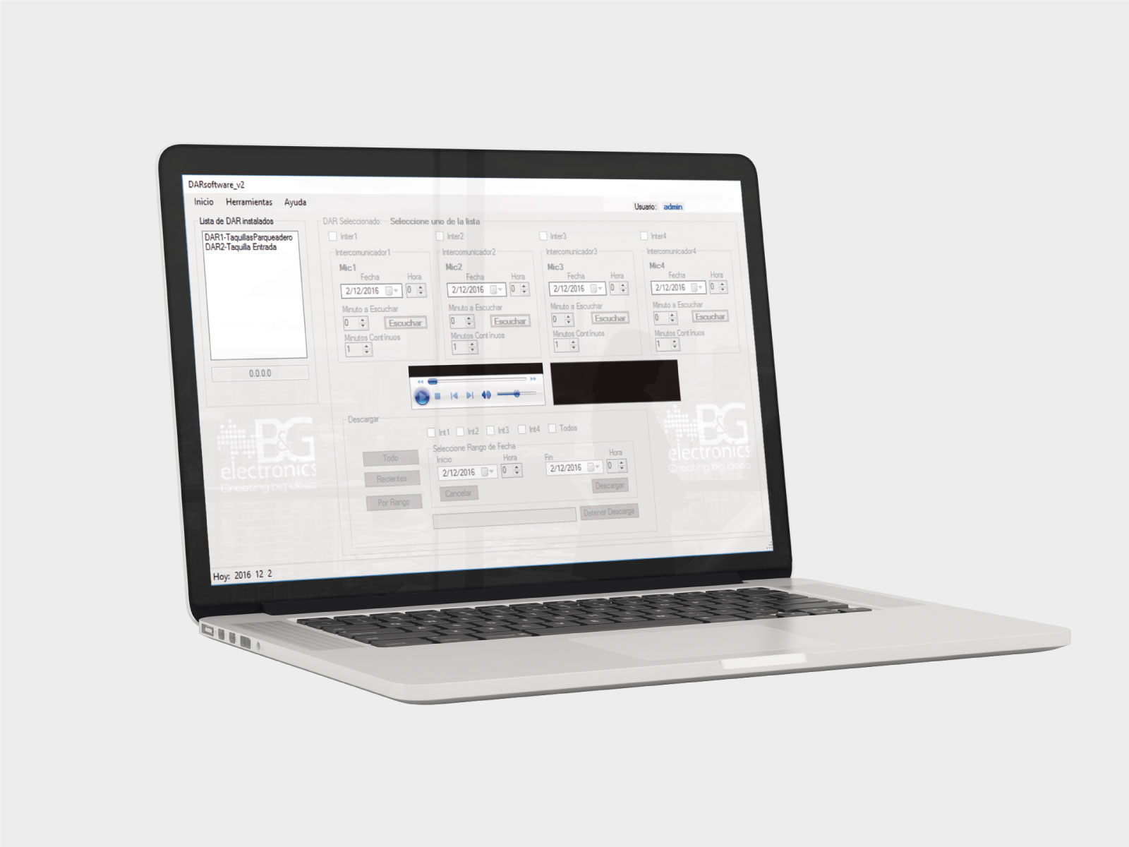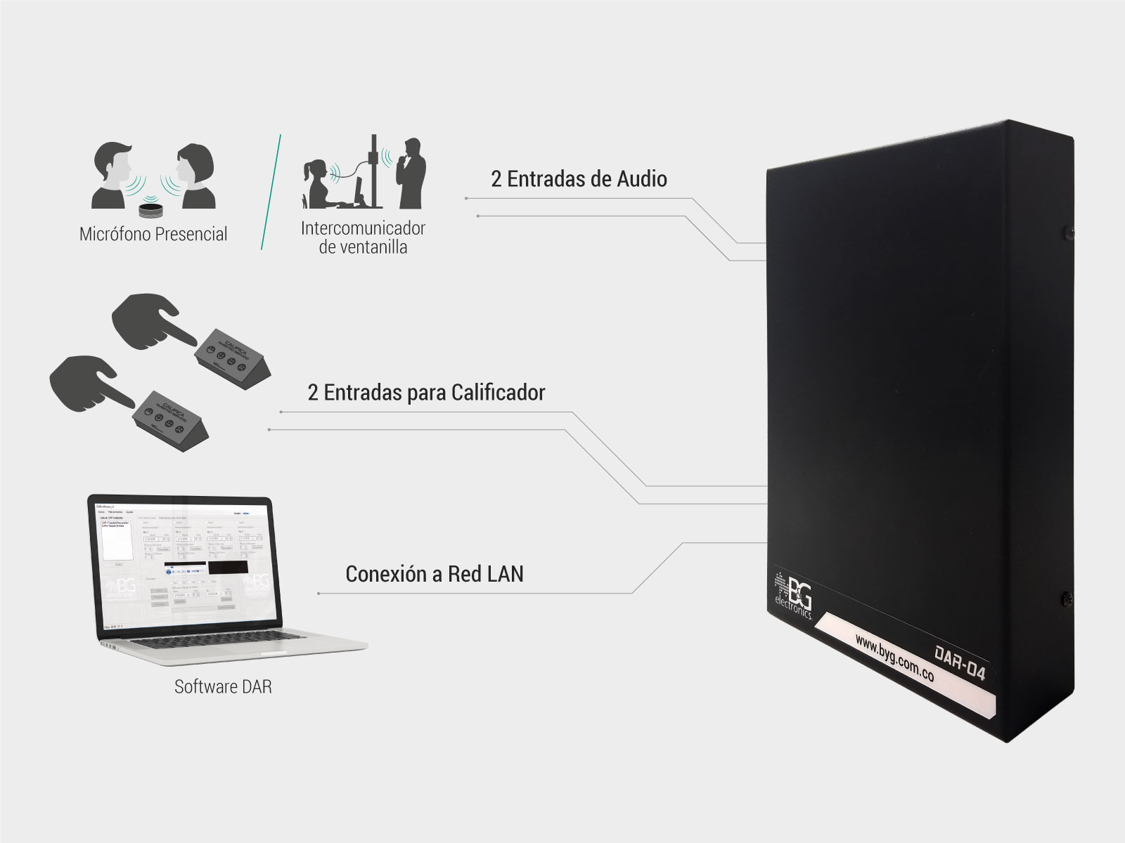 El sistema se compone de una unidad electrónica para anclaje en pared y un software que permite administrar las entradas de audio, programar tiempos de grabación, escuchar y descargar las grabaciones.
