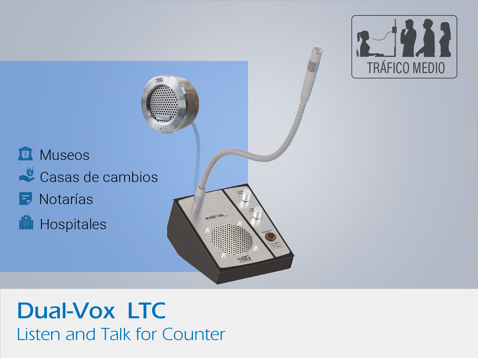 Intercomunicador diseñado para zonas con ruido ambiente medio como oficinas, proyectando una excelente imagen corporativa gracias a su elegante presentación con acabados en aluminio y acero.