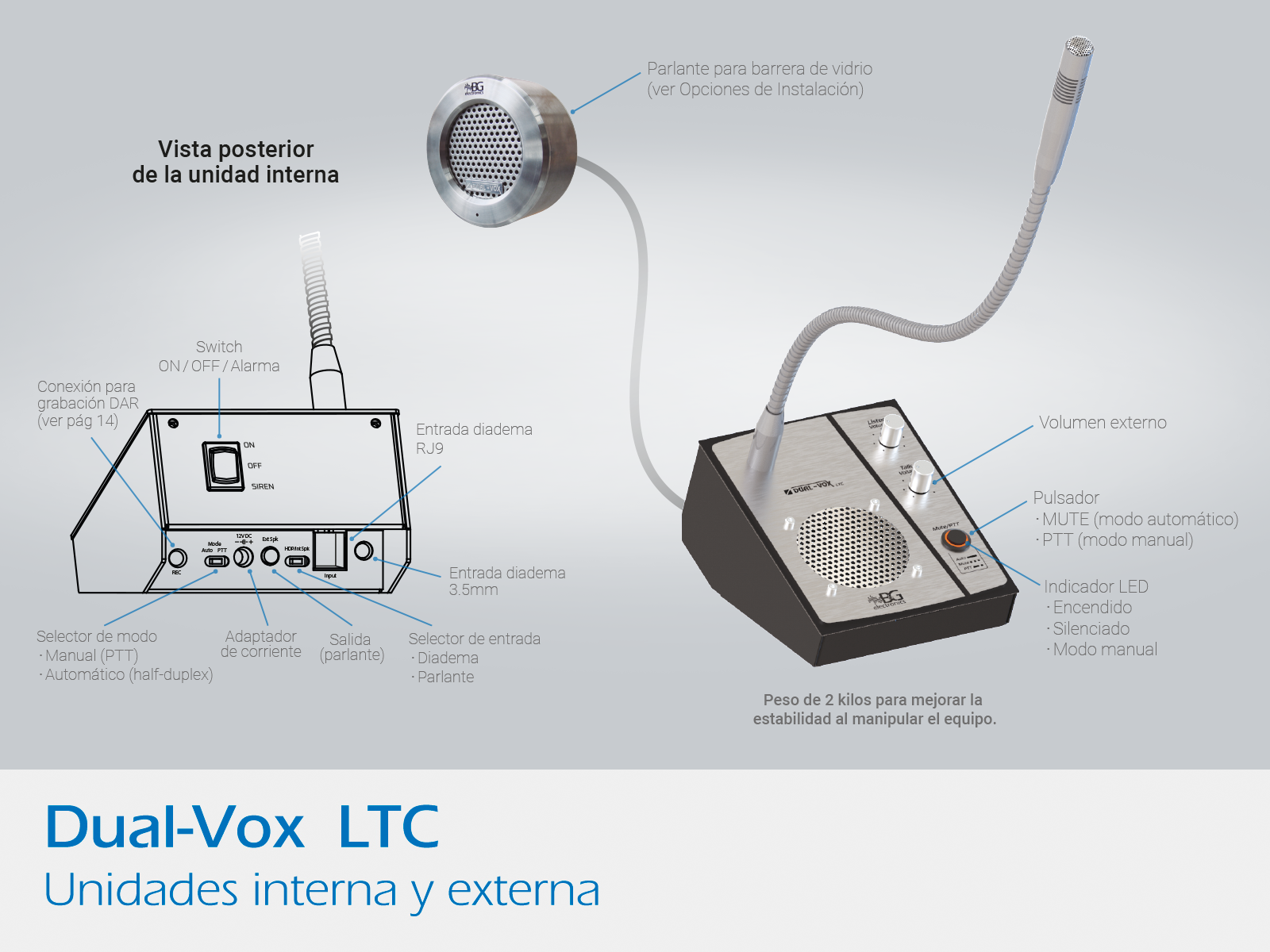Consta de una unidad interna de escritorio y un parlante externo de fácil instalación que no requiere perforación en vidrio.