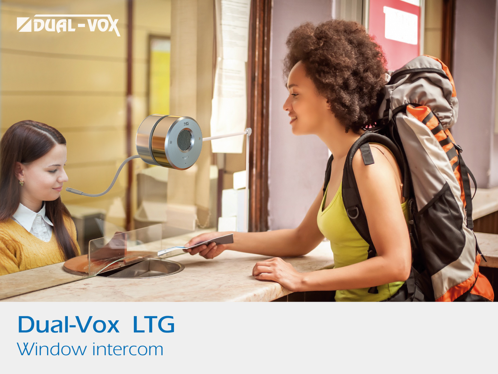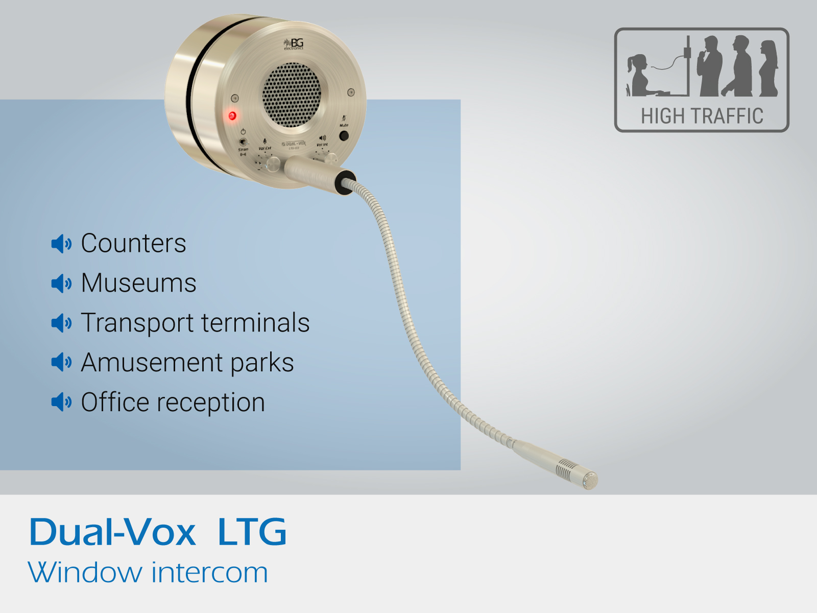 Intercom for window and partitions mounting. Ideal for high traffic areas where ambient noise conditions make communication difficult.