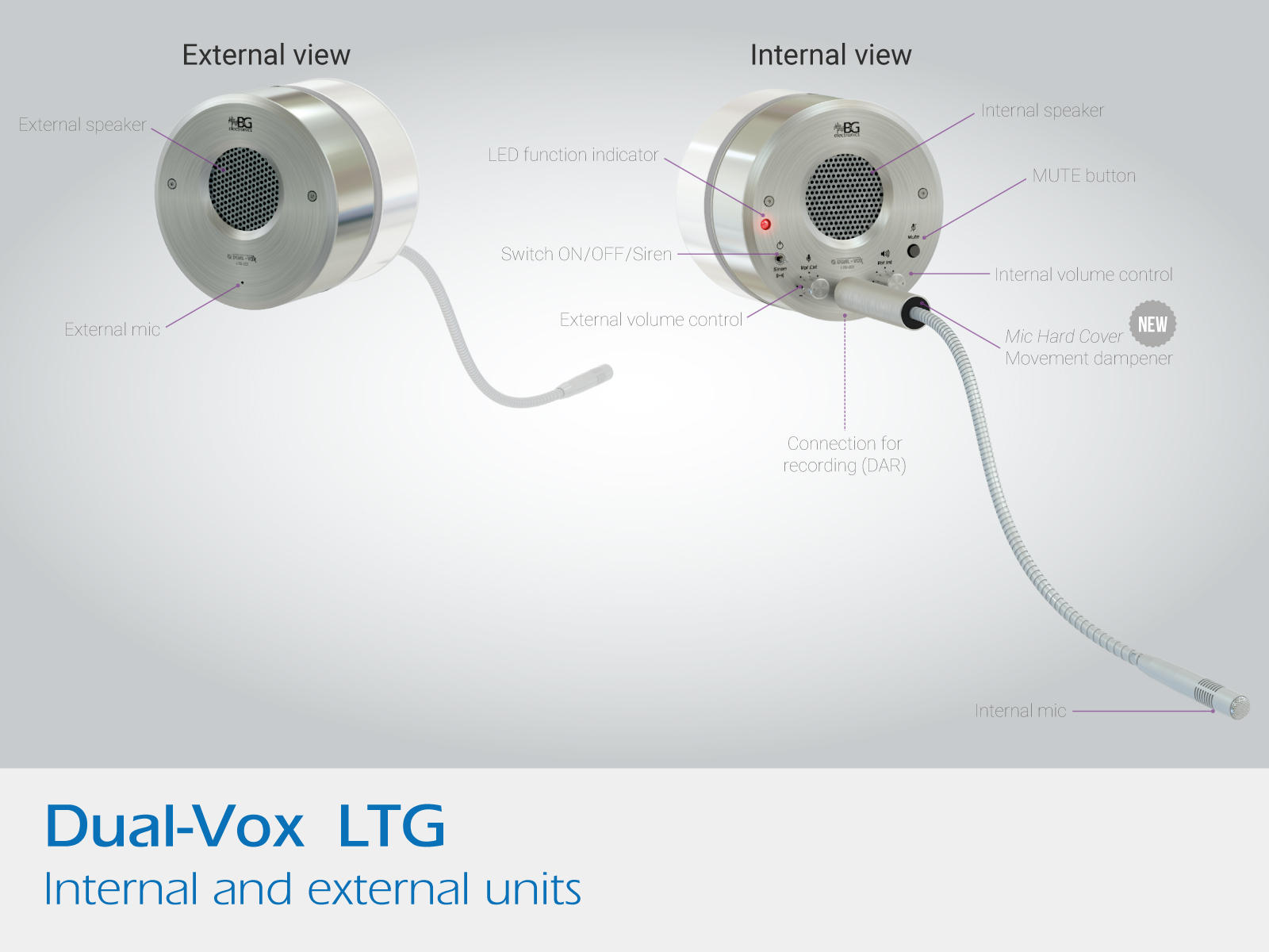 *The external unit has more power for ambient noise and has a speaker and microphone.