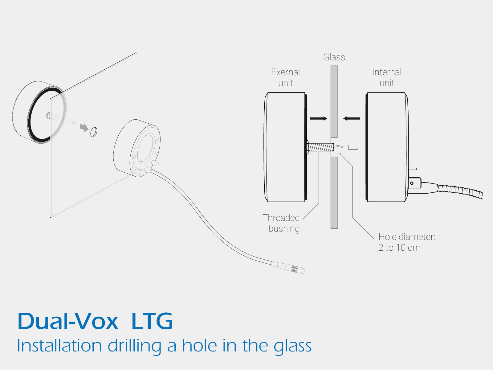 LTG intercoms come by default to install in perforated glass. The diameter of the hole in the glass is minimum 2cm and maximum 10cm.