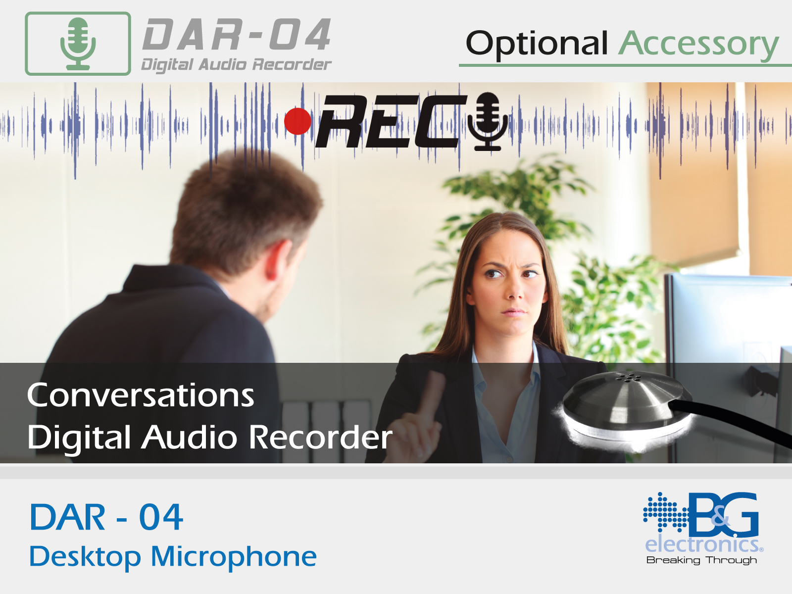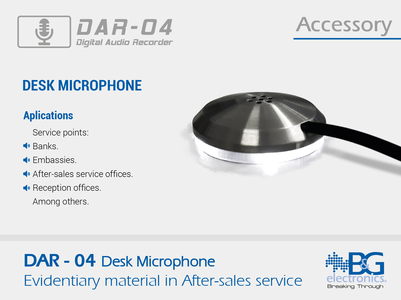 Microphone for use with the DAR digital audio recorder. It projects an excellent corporate image thanks to its elegant presentation with steel finishes.