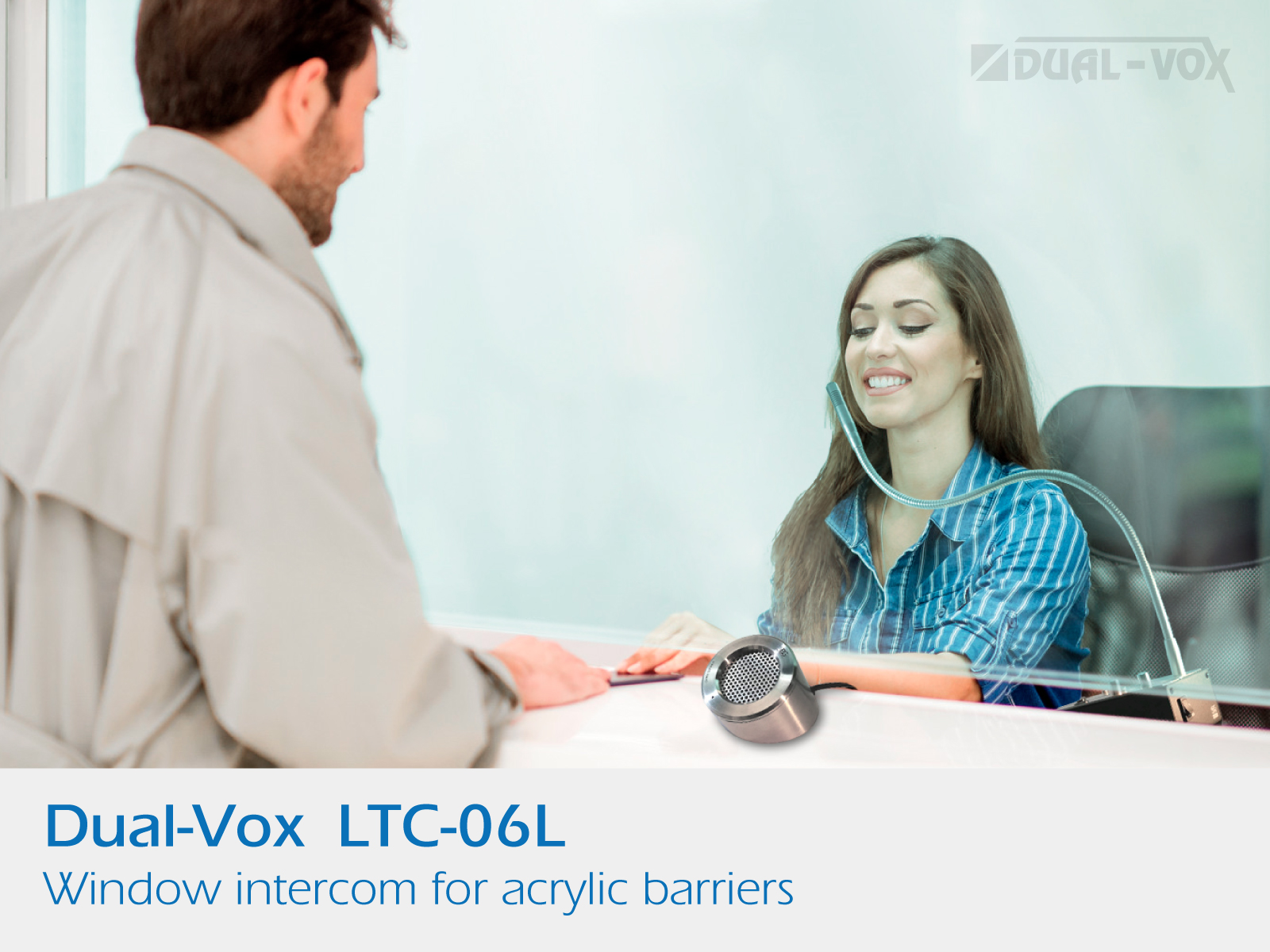 Window intercom model for acrylic barriers and partitions. Easy to install, does not require mounting in the acrylic or glass.