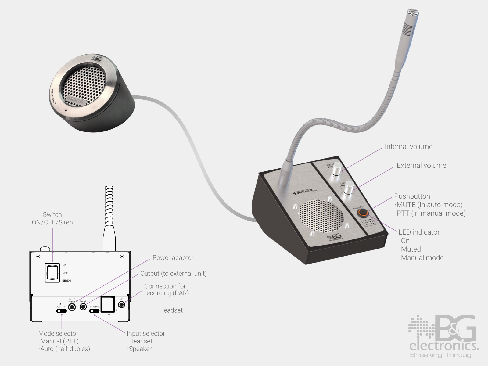 *The internal unit has a power, mute, audio direction indicator (from the outside in or out. The priority is the internal microphone), on / off switch, mute button and volume controls. Desktop location for easy accommodation and user use.