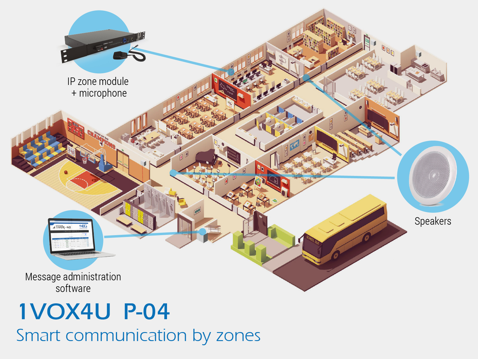 The system allows audios to be broadcast to specific areas or in groups through IP communication, from 1 scalable zone to 99 zones.