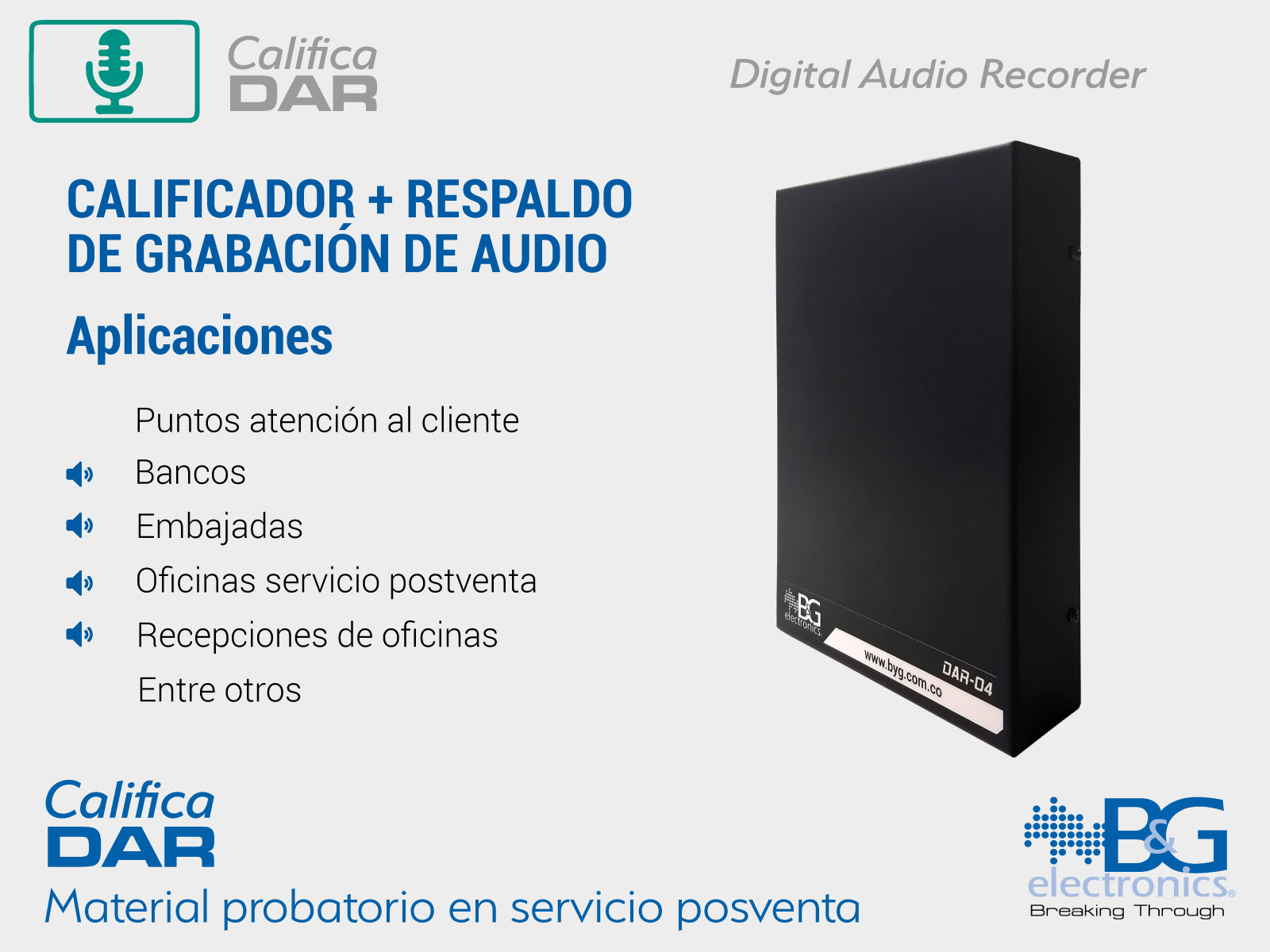 Registra la calificación del servicio prestado por el colaborador en conexión con el grabador de audio DAR para proporcionar una información completa. Incluye un software para procesar la información registrada.